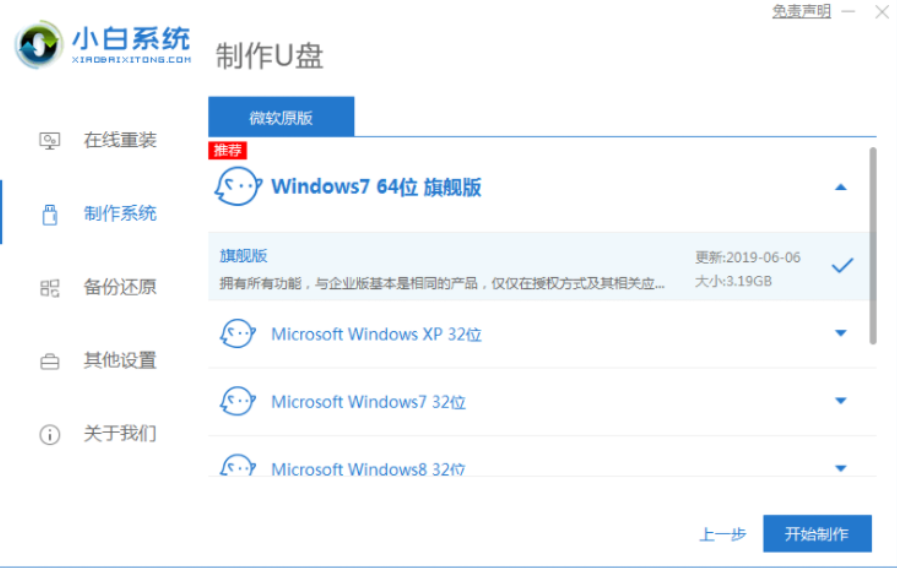 2、选择需要安装的系统,点击“开始制作”。