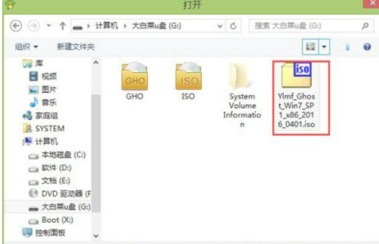 3,如图下点击打开u盘中的ghost win7系统镜像包,然后点击“打开”进入下一步。