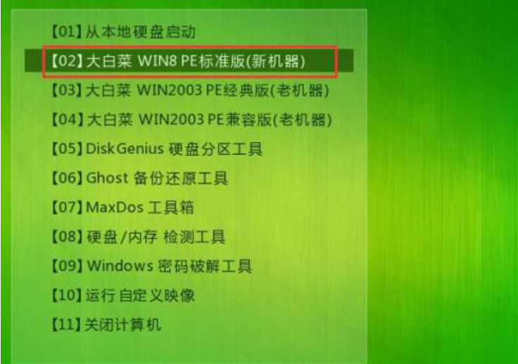 1,将事先制作好的大白菜u盘插入电脑USB接口,然后重启电脑,在出现开机画面时按 F12 或一些其它常用的 Esc 或 Del、F2 之类的启动快捷键进入u盘启动进入PE选择界面,选择“【02】大白菜win8标准版(新机器)”回车键,进入pe系统桌面。