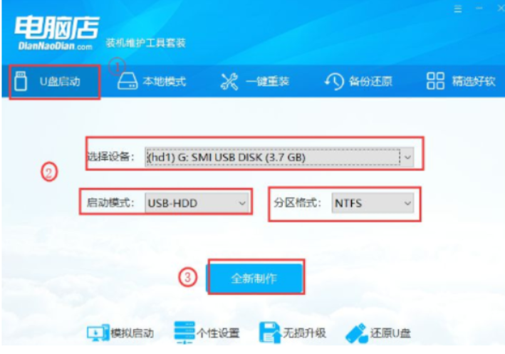 2.插入U盘到电脑上,点击“U盘启动”;选择U盘设备,默认会自动识别,如果有多个U盘,需手动选择;启动模式选择“USB-HDD”,分区格式选择“NTFS”,点击“全新制作”。