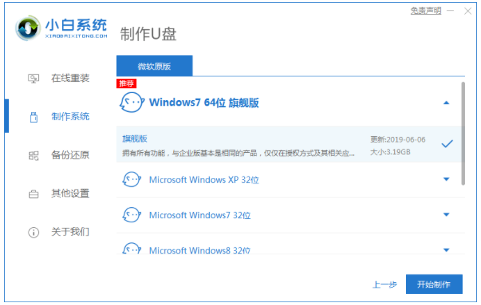 1.打开小白一键重装系统,点击【制作系统】,再插入u盘点击【开始制作】。