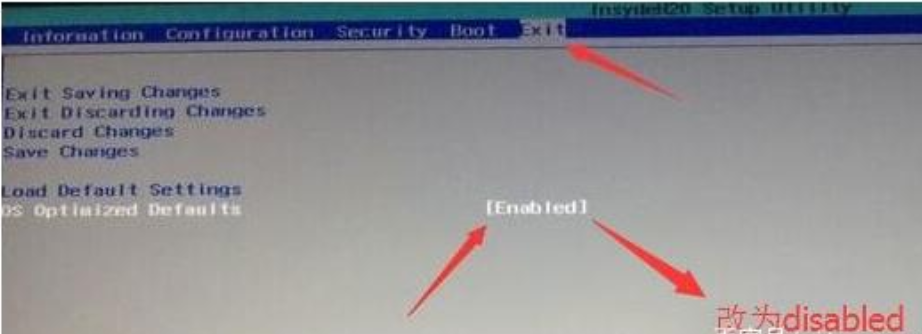 2.进行后大家将页面迁移到【Exit】选项之中,把【OSOptimized将Defaults设置为“Disabled”,进而适用别的操作系统和U盘正确引导操作。