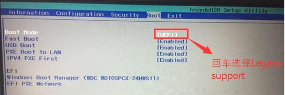 3.切换到“Boot”选项,将“BootMode”从UEFI改成“Legacy”Support】那样它就能适用传统式正确引导开展U盘启动了
