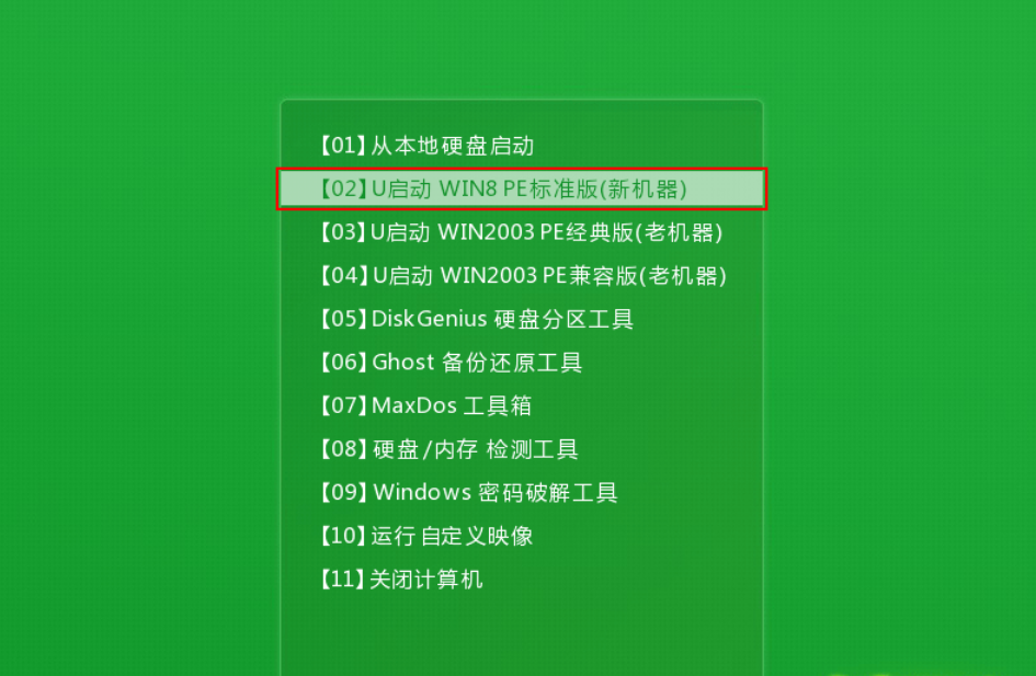 第一步:将制作好的u启动装机版启动u盘插入电脑usb接口(如果是台式机,建议插在主机箱的后置接口),然后开启电脑,等到屏幕上出现开机画面后按快捷键进入到u启动主菜单页面,接着将光标移至“【02】u启动WIN8 PE标准版(新机器)”,按回车键确认,如下图所示: