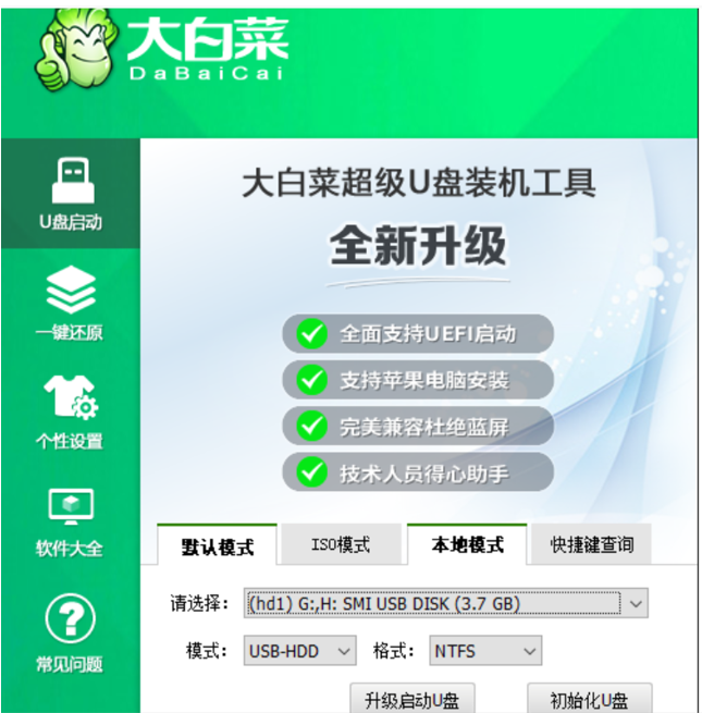 1、打开大白菜超级U盘装机工具,点击主界面的【U盘启动】模块,然后选择【默认模式】。