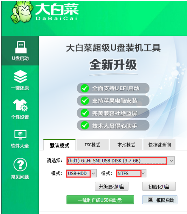 1、打开大白菜超级U盘装机工具,点击主界面的【U盘启动】模块,然后选择【默认模式】,在【请选择】后面选择需要制作启动的设备(插入的USB设备,一般会默认读取该设备)。