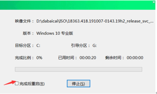 12、勾选【完成后重启】,一定要在重启前拔掉U盘,以免再次进入大白菜PE系统。