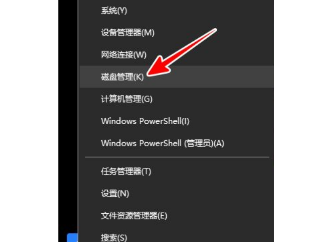 1、将 U 盘插入电脑后,右击左下角的 Win 图标,在弹出的菜单中点击“磁盘管理”。