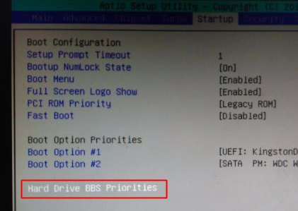 5、如果是以下界面,按→方向键切换到Boot或Startup,选择Hard Drive BBS Priorities回车;