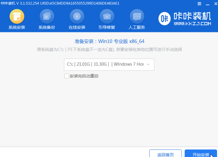 5、在pe系统桌面上打开咔咔装机工具,然后选择系统点击安装。