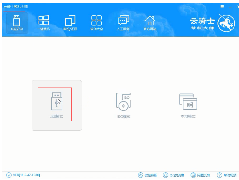 01先下载云骑士装机大师,然后 插入U盘以后打开云骑士装机大师,点击上面的U盘启动选项卡,选择左边的U盘模式。