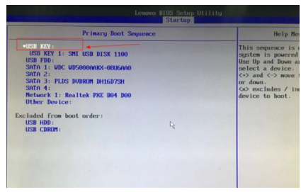 6、进入设置明细界面,通过按小键盘的“+”和“-”(加减号)实现顺序的改变,将usb key 设置为第一项,(有的电脑可以能是usb Hdd)。