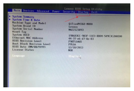 4、进入BIOS界面后,使用方向键盘,选择startup选项。