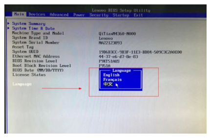 8、若果是bios带有语言选项,对英文不熟悉的,也可以在MAIN中选择Language语言选项,将语言设置为中文界面进行操作。