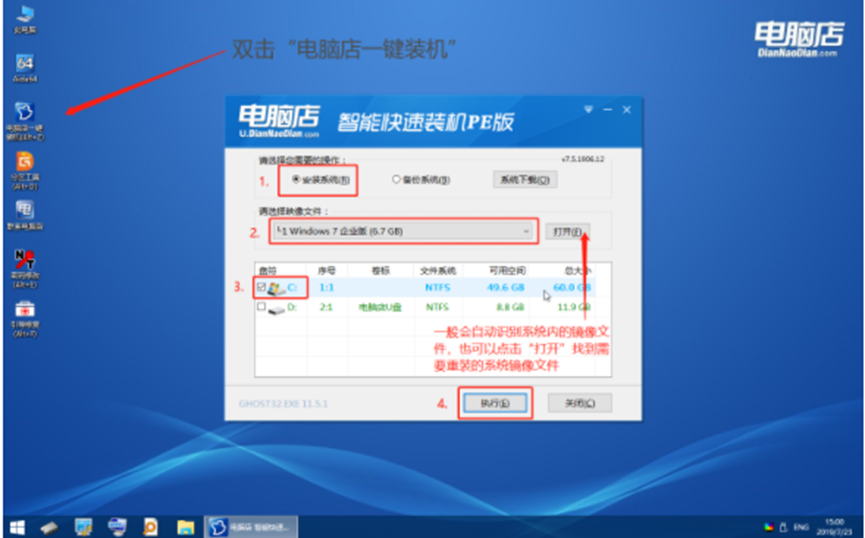 1、双击“电脑店一键装机”,选择“安装系统”,点击“打开”,找到并选中Windows镜像文件。