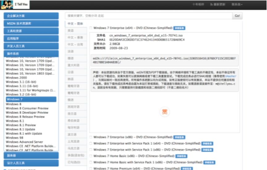 7、下载一个windows系统镜像文件,搜索msdn itellyou进入,在界面中点击“操作系统”,选择需要的系统版本,复制ed2k链接进行下载。