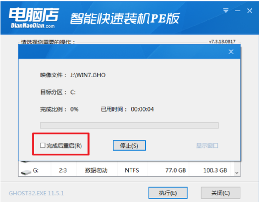 4、进行安装时,勾选“完成后重启”重启电脑并拔掉U盘。