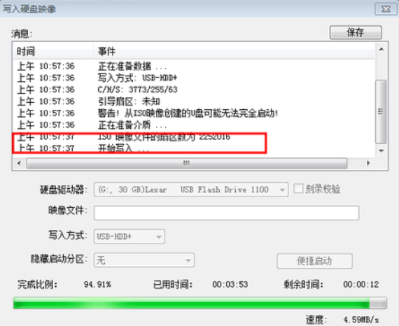 4.当我们选择u盘之后,写入方式选择“USB-HDD+”,点击写入就可以啦。