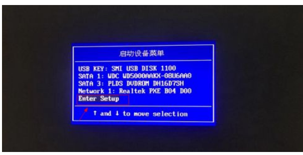 2.然后在启动设备菜单窗口中,选择“ENTER Setup”进行BIOS设置。