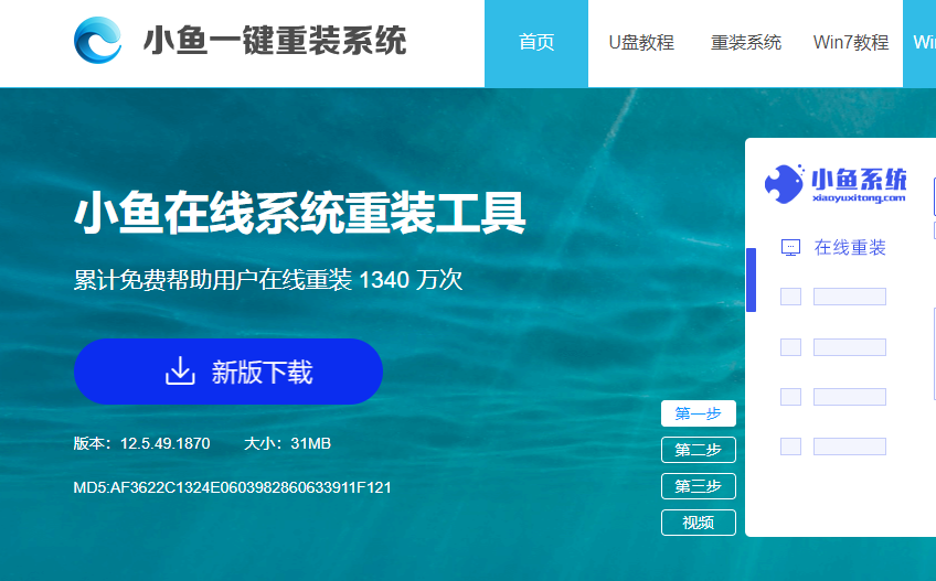 1、进入小鱼一键重装系统官网,点击新版下载到电脑上进行安装。