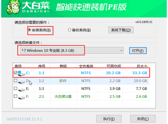 3.打开装机软件,选择win10映像文件,勾选“C盘”,点击执行。