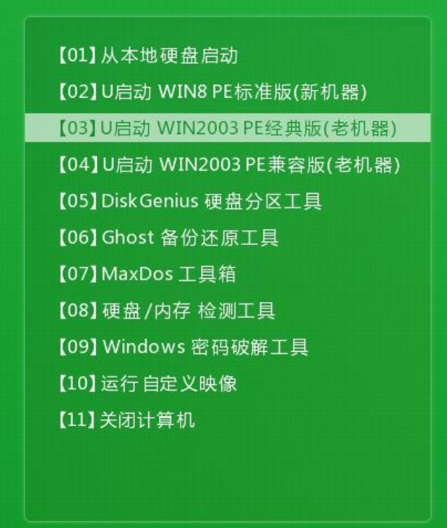将准备好的u启动u盘启动盘插在电脑usb接口上,然后重启电脑,在出现开机画面时通过u盘启动快捷键进入到u启动主菜单界面,选择【03】U启动WIN2003 PE经典版(老机器)选项: