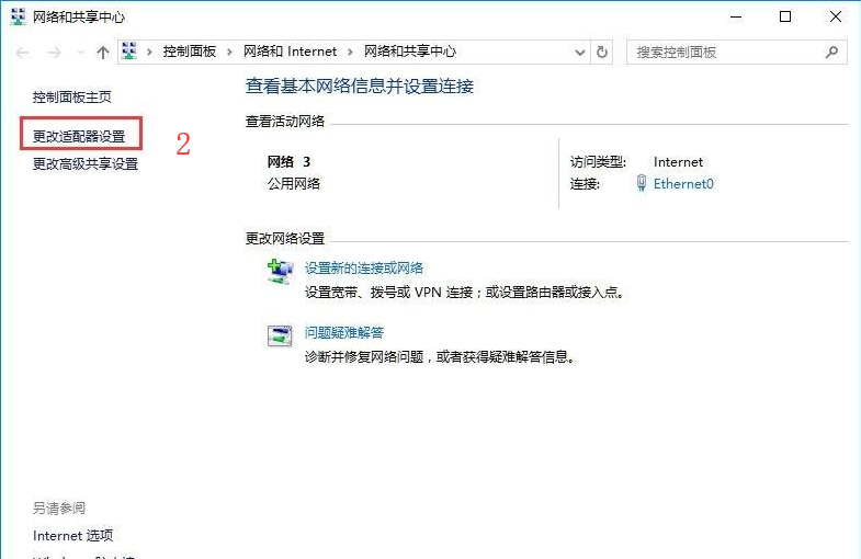 2.在打开的网络和共享中心界面的左侧找到并点击打开更改适配器设置,进入下一步。