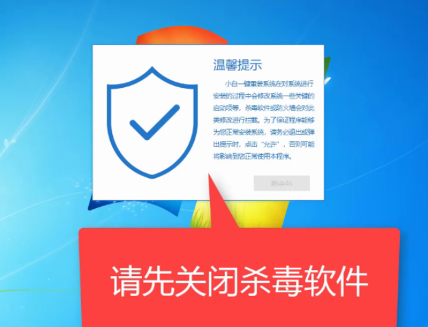 1、打开下载好的最新版本的小白一键重装系统软件,出现温馨提示窗口,关闭杀毒软件。(在重装系统时会对修改系统的一些启动项,避免因拦截造成重装失败)。