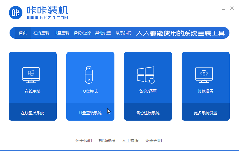 1、搜索咔咔装机官网,下载安装咔咔装机一键重装系统工具到一台正常上网的电脑上打开,将准备好的u盘插入电脑,点击U盘重装系统。