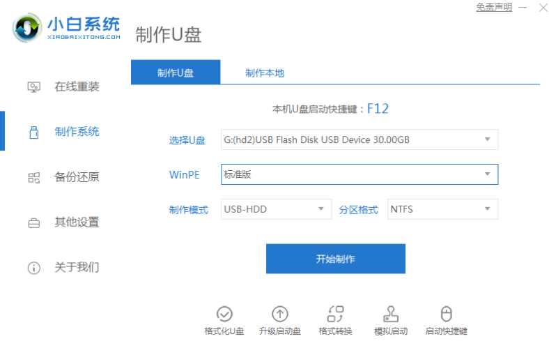 1.首先找一台可用的电脑下载安装小白一键重装系统工具并打开,插入8g以上的空白u盘,选择开始制作。