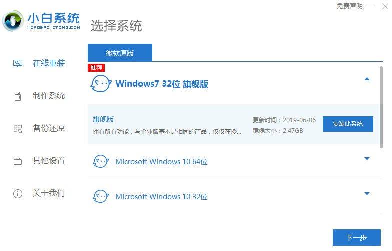 1.在“小白一键重装”系统网站(http://www.xiaobaixitong.com/)下载小白一键重装系统软件,打开软件,选择所需的win7系统版本。