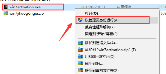 1、我们以比较常用的win7 activation激活工具为例,先自行网上搜索并下载该工具到电脑磁盘上,然后可以使用winrar等解压工具解压得到win7activation.exe的文件。选中主程序exe文件,鼠标右键以管理员身份运行。