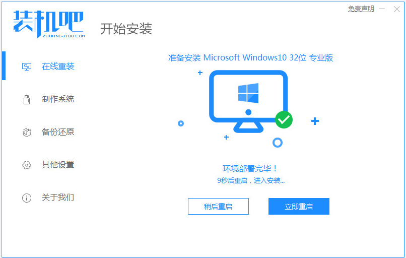 1.首先打开win7旗舰版系统桌面上的【装机吧在线系统重装工具】,进入页面后,点击win10镜像,选择安装。