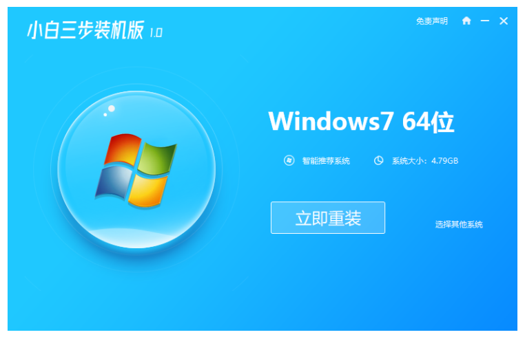 1、浏览器搜索小白一键重装系统官网,下载小白三步装机版软件并打开,选择win7系统,点击立即重装。