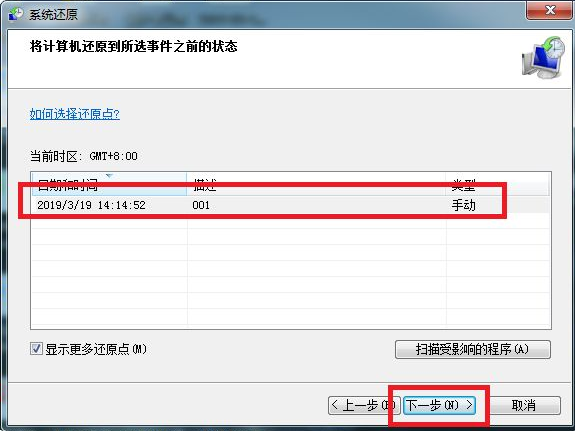4、在向导中点击下一步来到系统还原,选择一个还原点,点击下一步。