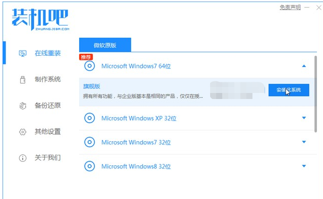 1、电脑安装好装机吧一键重装系统软件并打开,在这就可以下载安装win7的64位系统