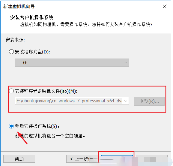 5、选择win7镜像,这里我们选稍后安装操作系统(我一般不喜欢简易安装),点击下一步。