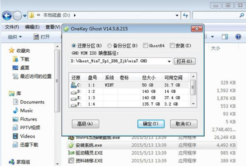 3、双击【安装系统.exe】,打开安装工具onekey ghost,选择“还原分区”,加载映像路径win7.gho,选择安装位置如C盘,点击确定。