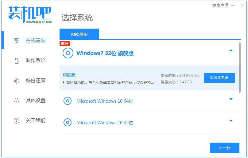 1、首先网上搜索并下载安装装机吧一键重装系统软件,进入软件主界面后选择需要的win7系统安装。