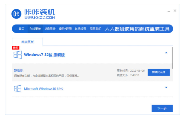 2、打开咔咔装机,选择在线重装栏目,点选需要安装的win7,点击安装此系统。