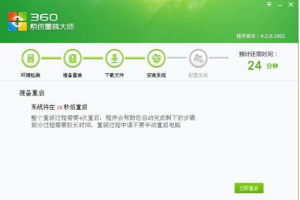 4、然后等待电脑系统环境下载完毕之后,立即重启电脑即可,等进入新的win7桌面之后,360系统重装就完成了。