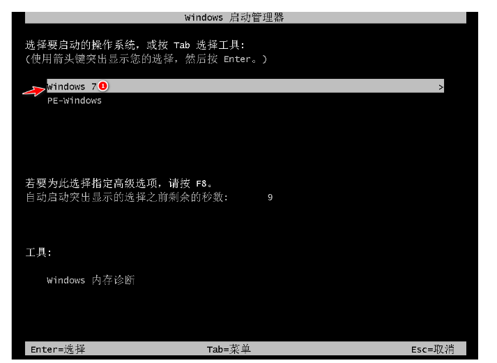 7、安装完成后,选择重启,点击Windows 7 菜单进。
