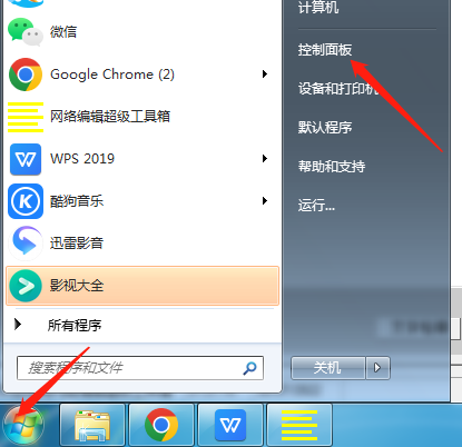 1、在电脑里点击开始打开,找到并打开控制面板。