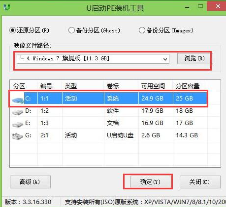步骤2、进入pe系统u启动pe装机工具会自动开启并识别u盘中所准备的原版win7系统镜像,操作完成后点击确定。(建议参考下图的内容选择系统版本以及磁盘安装分区。)
