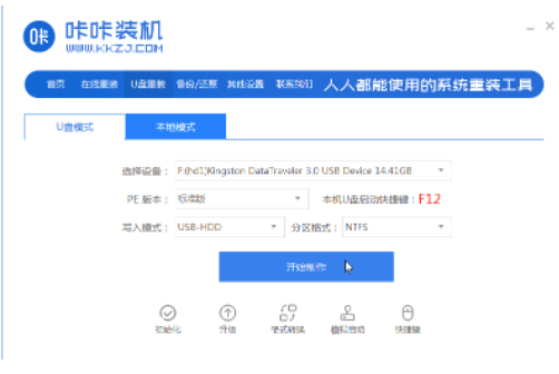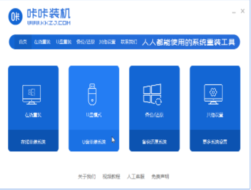 1、下载安装咔咔装机软件并打开,选择U盘重装系统,点击下一步。