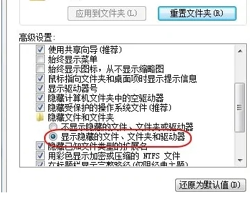 5.在查看高级设置界面中,隐藏文件和文件夹选择显示隐藏的文件、文件夹和驱动器,点击确定,win7就可以显示隐藏文件夹啦。