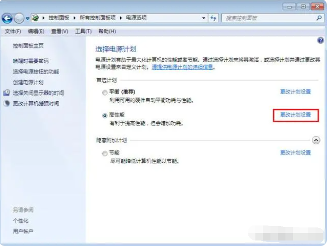 3、在右侧框中找到“首选计划”,点击“更该计划设置”。