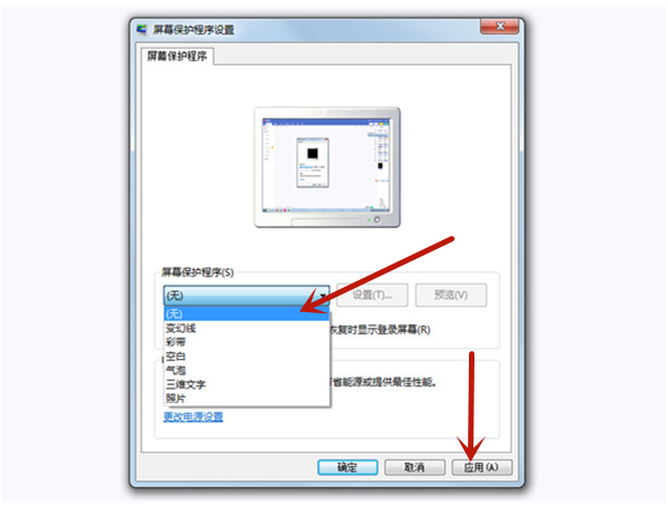 3、在屏幕保护程序列表中,我们选择无后,点击应用并确定即可。