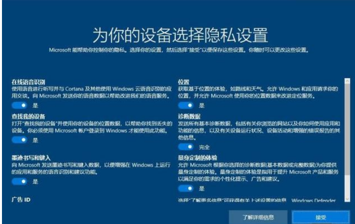 6.更新完成后,进入“为你的设备选择隐私设置”,一般都选择默认,我们也可以根据你自己的需要进行选择,选择完毕后点“接受”。