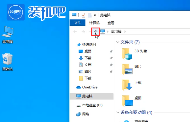 1、打开此电脑,点击路径栏左侧的“↑”按钮。
